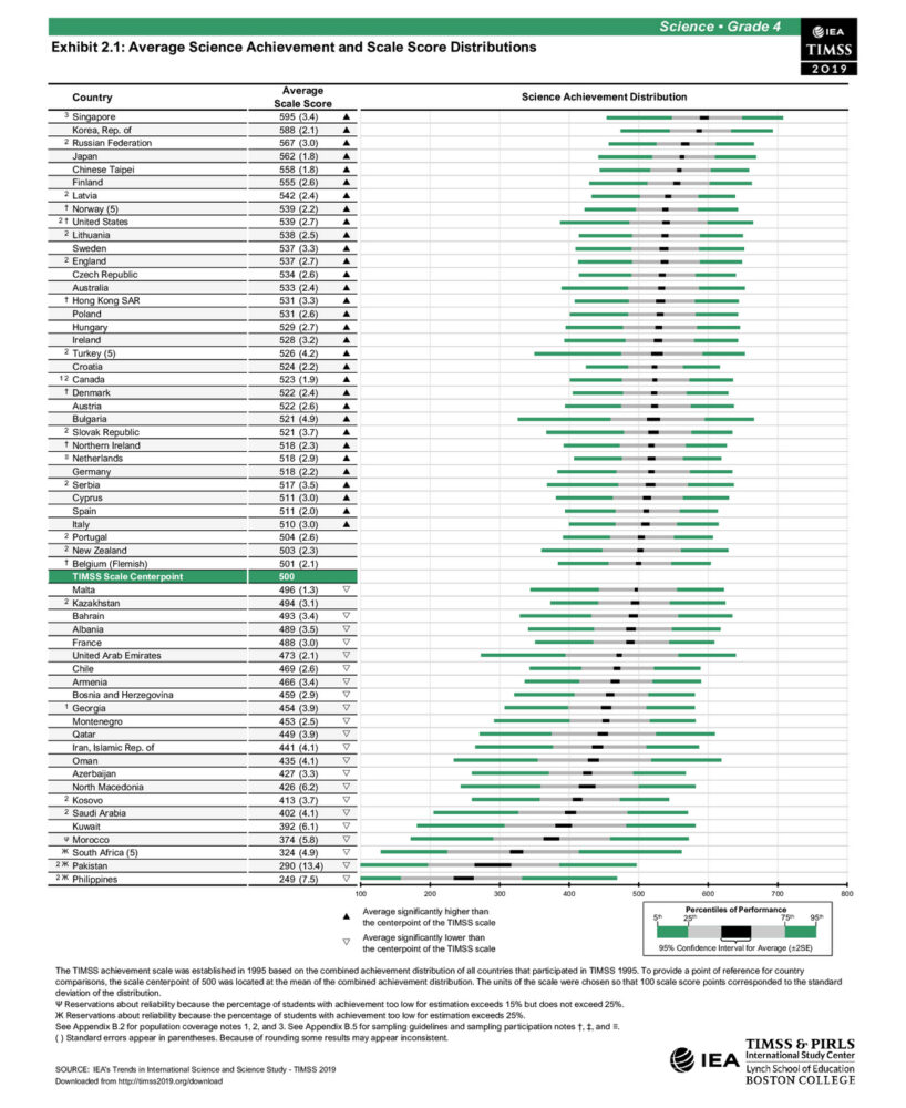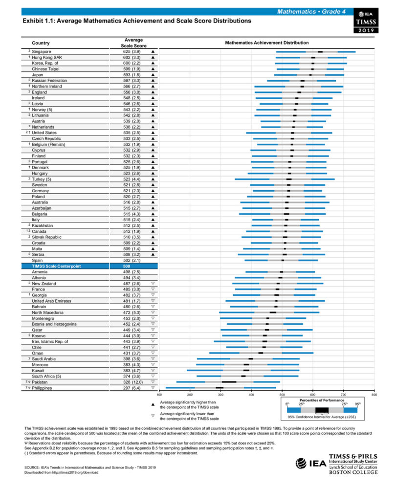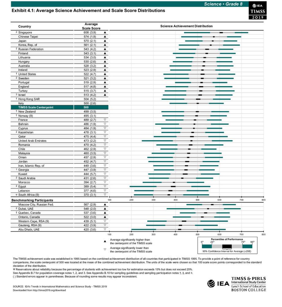 TIMSS bada znajomość matematyki i nauk przyrodniczych w klasach 4 i 8. Średni wynik to 500 punktów, wyróżnione są cztery poziomy wiedzy: niski(400 punktów), pośredni (475 punktów), dobry (550 punktów) oraz wybitny (625 punktów). Poniżej przykładowe wyniki testu z matematyki dla ośmioklasistów; tabele z pozostałymi wynikami znajdują się na końcu tekstu. W lewej kolumnie są kraje uszeregowane według wyników, w prawej pokazane jest, jak wyglądają wyniki kolejnych grup 25% uczniów, od najgorszych do najlepszych.