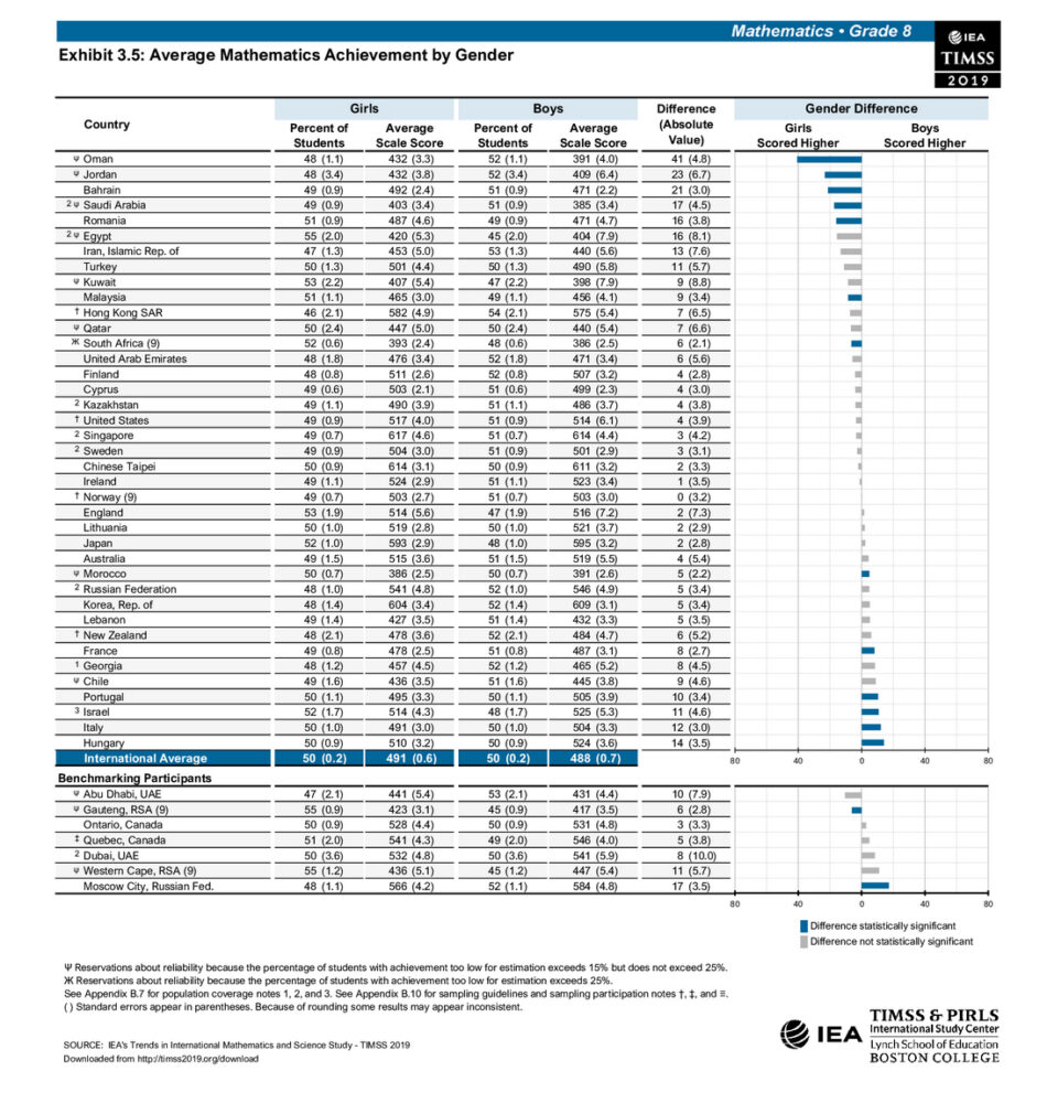 Niezwykle ciekawe, a nawet zdumiewające, jest porównanie wyników osiąganych przez dziewczynki i chłopców (Tabela 5 na końcu tekstu; tutaj pozostałe tabele). W prawie wszystkich badanych krajach muzułmańskich, niezależnie od wieku, dziewczynki mają wyniki lepsze albo dużo lepsze od chłopców z matematyki i z nauk przyrodniczych. Wyjątkiem są Iran i Turcja, gdzie wyniki trochę lepsze mają chłopcy. Natomiast Arabia Saudyjska, Pakistan, Oman, należą obok Filipin i RPA (krajów z końca tabel) do krajów o największych różnicach na korzyść dziewczynek.